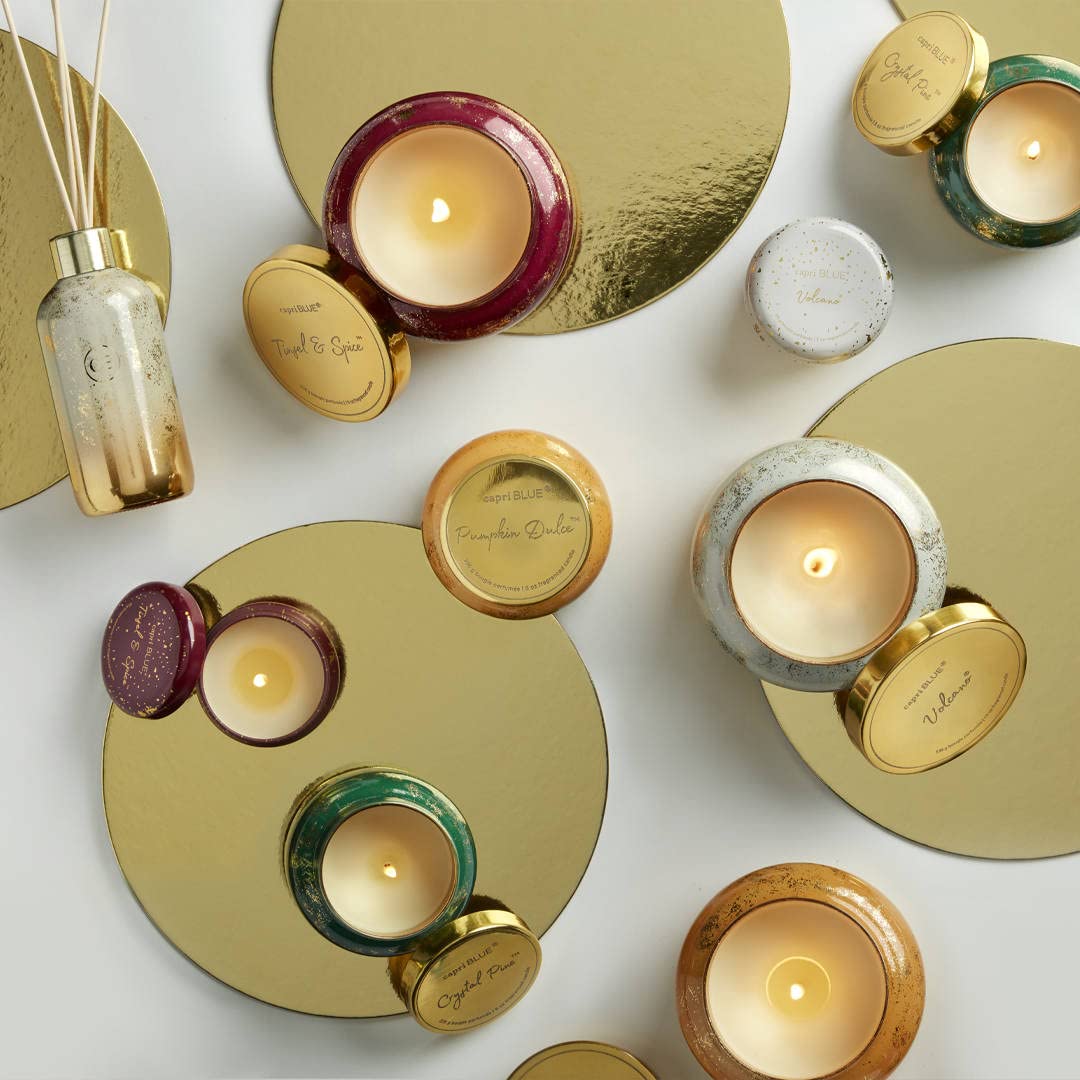 Capri Blue Glimmer Candle Holiday Gift Set - Volcano, Crystal Pine, Pumpkin Dulce, Tinsel & Spice - Luxury Aromatherapy Candles - 3 Oz Each