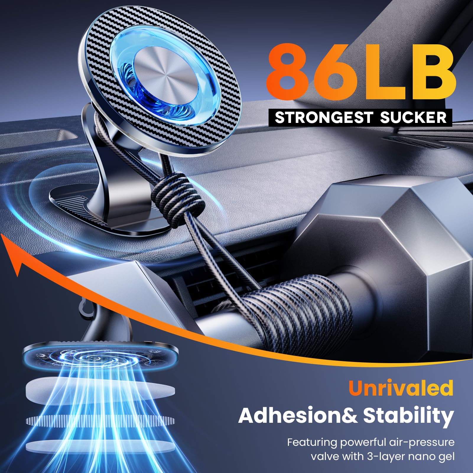 - 【THE MR. RIGHT OF SUCTION POWER FOR YOUR CAR】 The right fit is the best fit. Based on extensive lab testing data and real using feedback from millions of customers, we we designed and created this magnetic car holder with suction power that perfectly aligns with user experience. The upgraded 3M adhesive pad mount features 86 lbs (The most suitable suction threshold as determined by testing) of suction power, ensuring maximum suction while also providing maximum protection for your dashboard surface.
