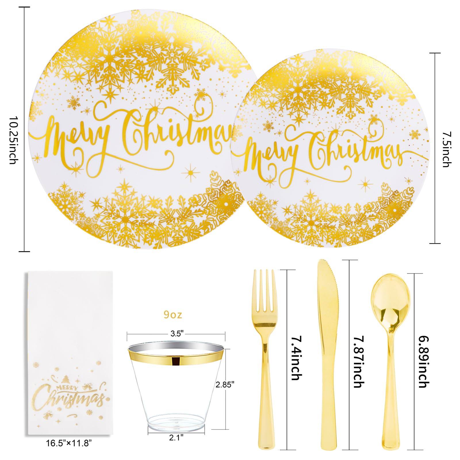 - Value Pack: Christmas plastic plates set include 25 gold dinner plates 10.25 inch, 25 gold salad plates 7.5 inch, 25 gold knives, 25 gold forks, 25 gold spoons, 25 gold cups 9 oz, 25 gold napkins. Put it in a sturdy box to prevent damage.