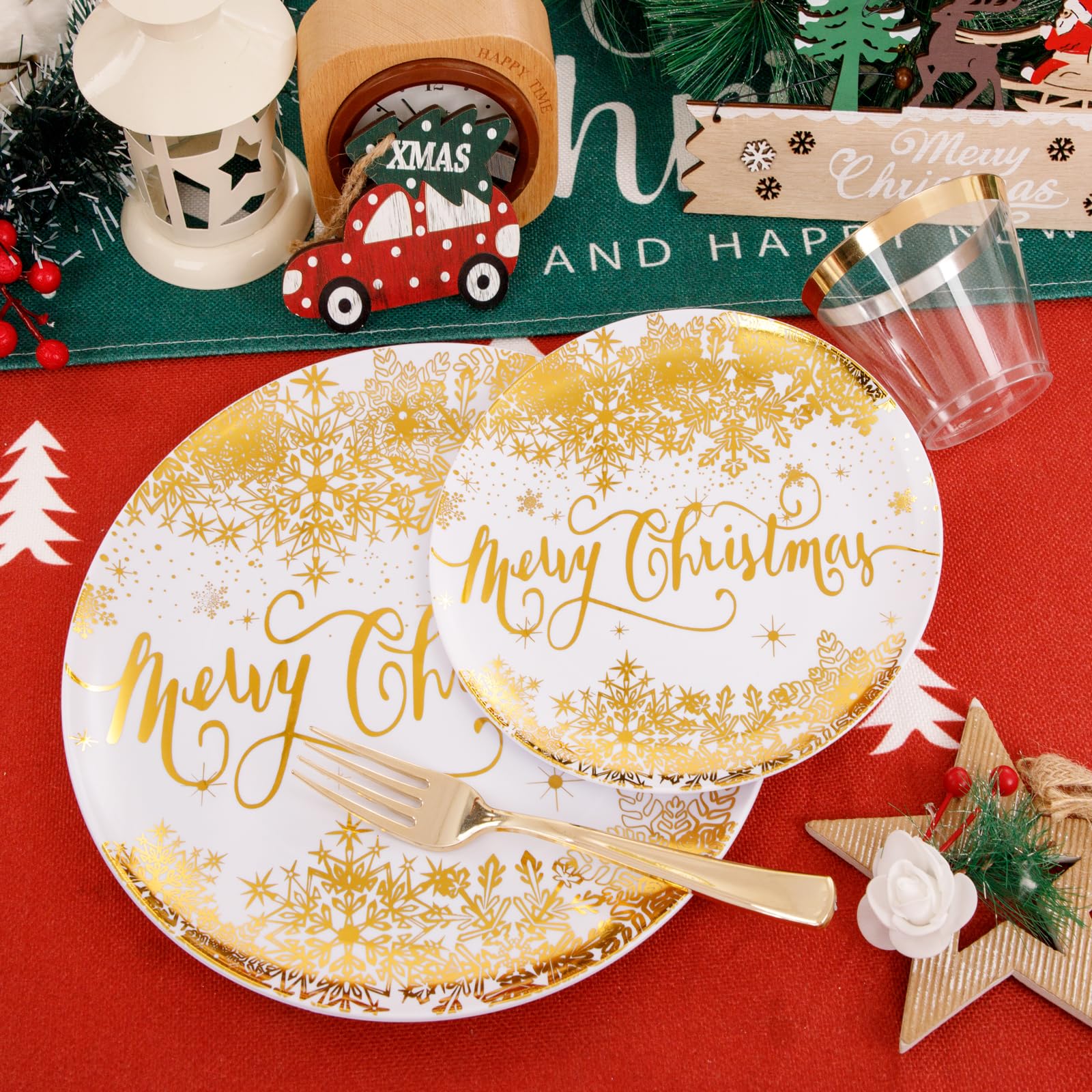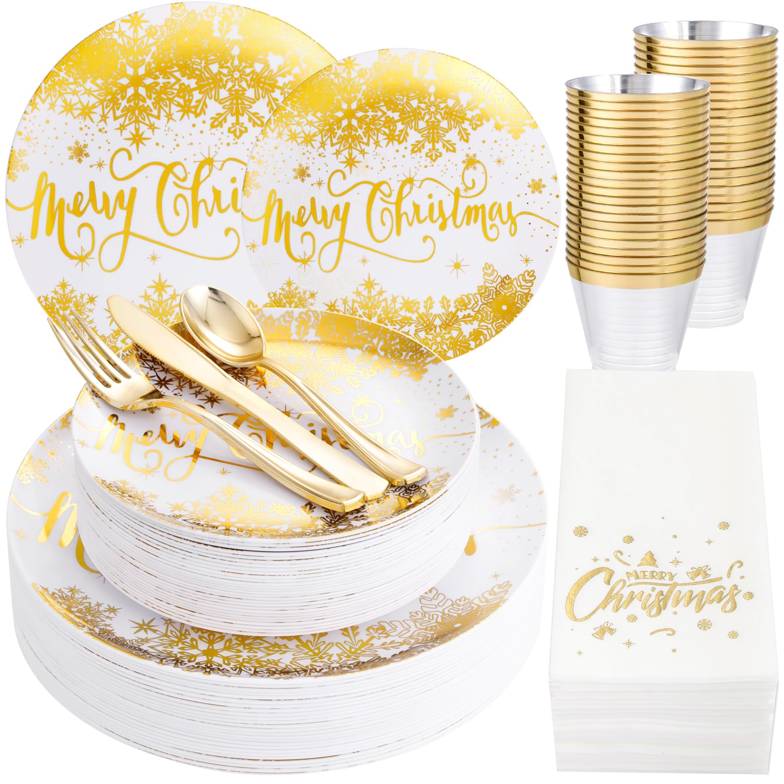 - Christmas Themed Design: These Christmas disposable plates feature a gold Christmas snowflakes. What's more, the Christmas-themed gold napkins and gold plastic tableware set in order to bring a happy holiday spirit to everyone who uses it.