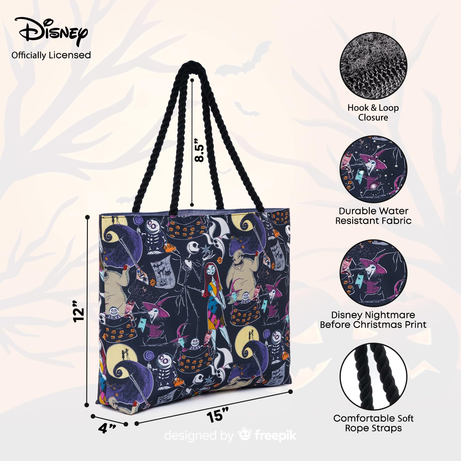 - šš¼šŗš³š¼šæšš®šÆš¹š² šš®šæšæšš¶š»š“: Featuring soft, black rope straps, this tote ensures comfortable carrying even when fully loaded. The straps distribute weight evenly across your shoulders, reducing strain during long days out. Whether you're wandering through Halloween Town or navigating your daily commute, you'll appreciate the ergonomic design of this Nightmare Before Christmas themed bag.