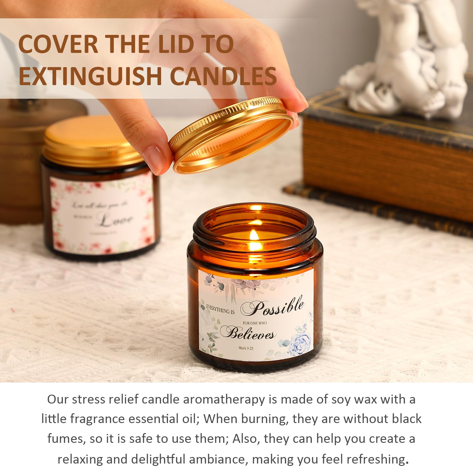 - Safe and Fragrant: our stress relief candle aromatherapy is made of soy wax with a little fragrance essential oil; When burning, they are without black fumes, so it is safe to use them; Also, they can help you create a relaxing and delightful ambiance, making you feel refreshing