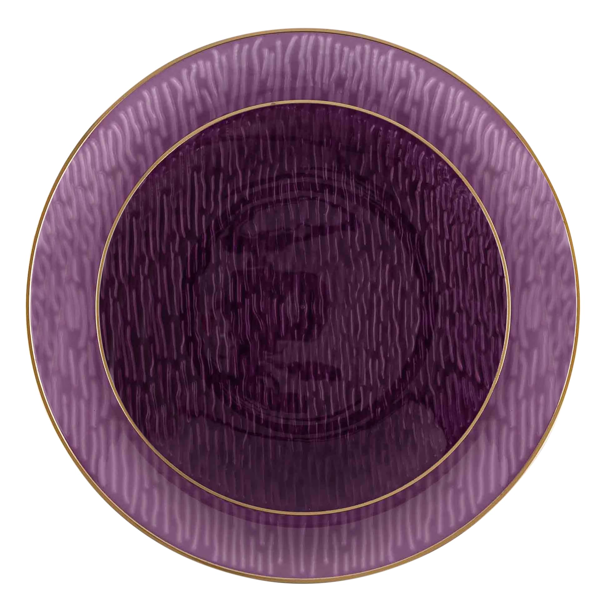 - 48 Pack Purple with gold rim disposable dishes. Each combo set includes 24 7 inch and 24 10 inch plastic dinner plates.