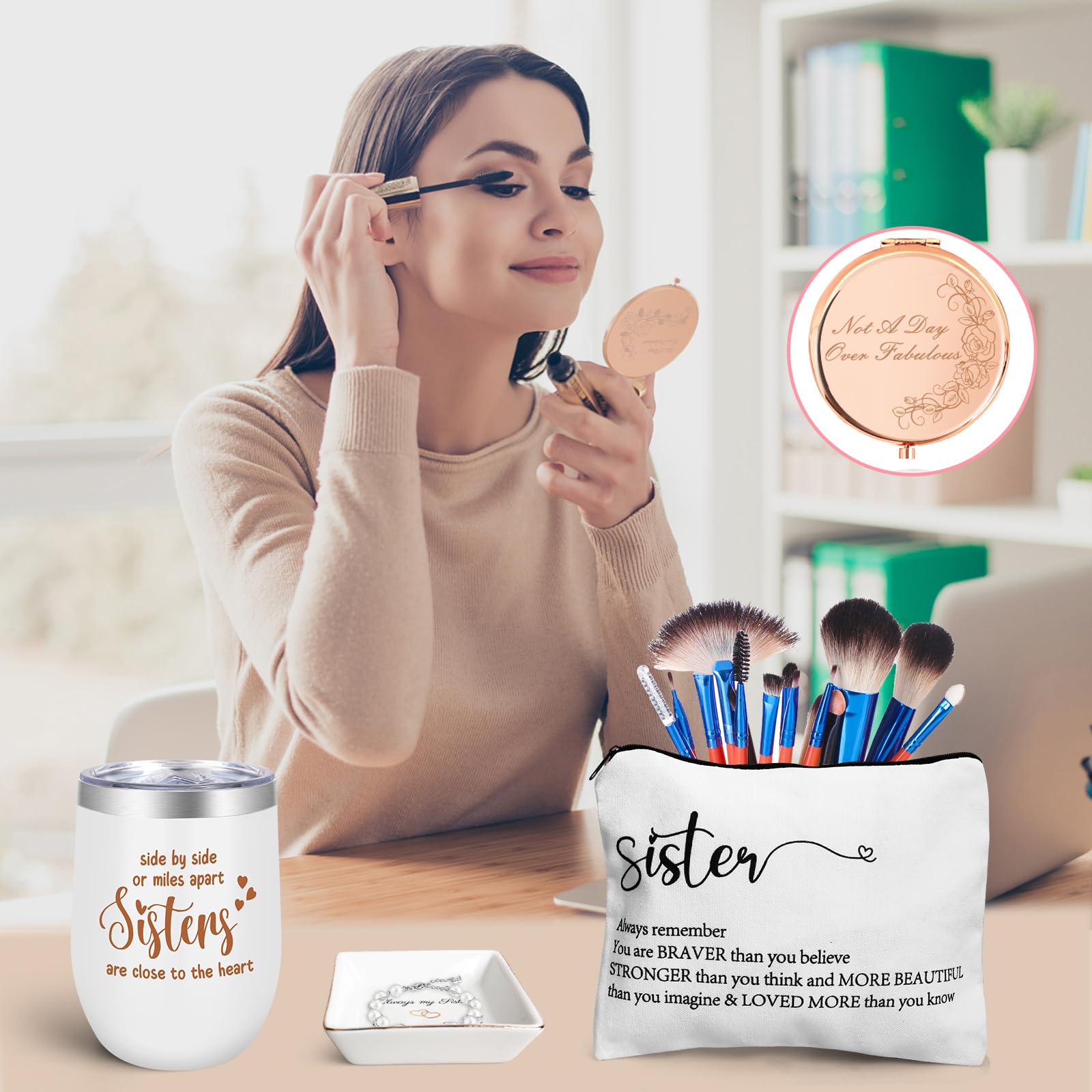 - Unique Gifts for Sister: This sister birthday gifts box contains 9pcs beautifully gifts, a 12oz white Insulated Tumbler with straw & cleaning brush, 14oz Candle that says 'A sister is God's way of making sure we never walk alone', to my sister Poster, Sister Cosmetic Bag, Pink Fizzy Socks that says 'BEST Sister EVER', 2pcs Bath Bomb, Cosmetic Mirror that says ' Not a day over fabulous', Jewelry Dish that says 'Always my sisters, forever my friend',Gift Card